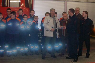 An der Seite der Jugendlichen befanden sich noch Michael Windhuis, Leiter der Feuerwehr und sein Vertreter Gerd Ripkens.Im Laufe des Gespräches informierte man die Spender über die aktuelle Personallage und über einige interessante technische Details.Bei der einzigen Frau die der Übergabe beiwohnte, handelt es sich um Petra Kuhn, die den Wahlbezirk 12 für die SPD betreut.